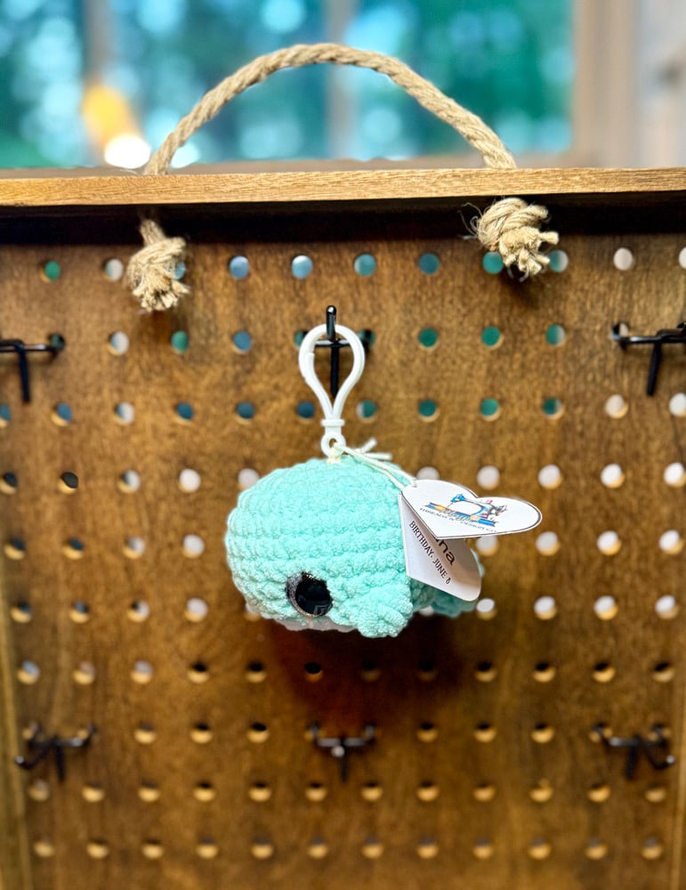 Say hello to Luna, the twinkly-tailed traveler from our Clip-On Buddies collection! She’s about 3" long, crocheted with plush, pastel seafoam yarn, and finished with glittery silver eyes that shimmer like starlight on the waves.