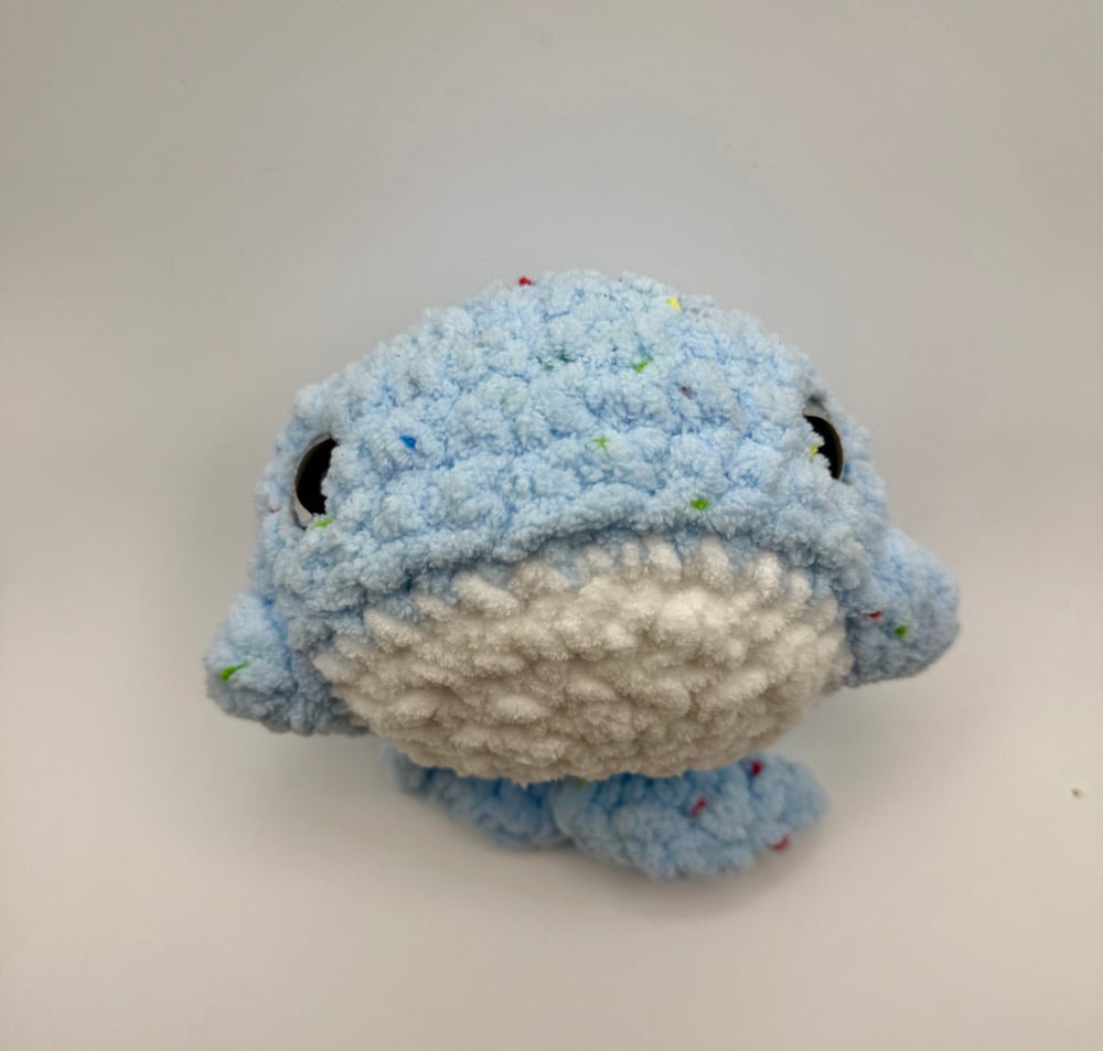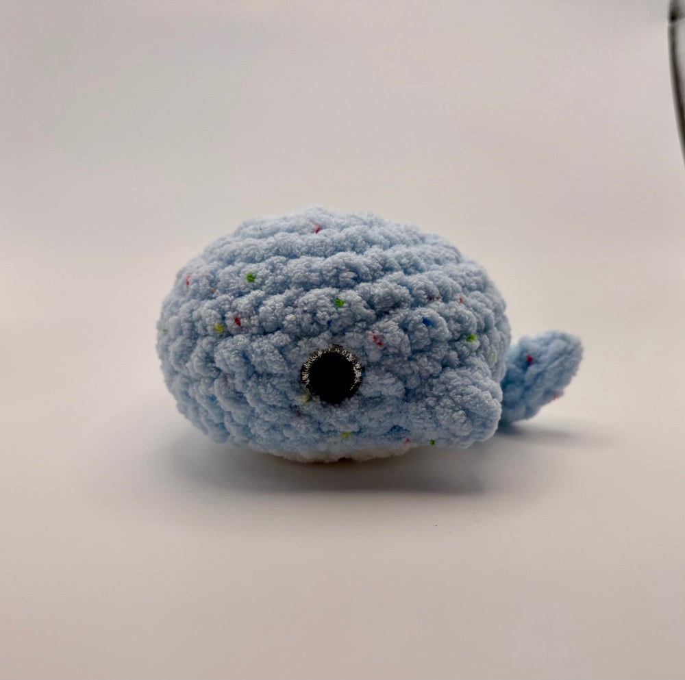 Say hello to Finfetti — a palm-sized crochet whale handmade with ultra-soft plush yarn in a light blue hue, speckled with confetti-like pops of color. Her sparkling silver safety eyes give her an extra dose of magic and charm.
